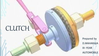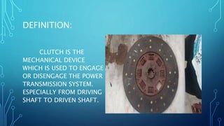 The document defines and describes the main parts of a clutch, which is a mechanical device that engages and disengages the power transmission system between the driving and driven shafts, usually between the engine and transmission. The main parts are the driving member, driven member, and operating member. It then describes the types of clutches, focusing on friction clutches. Friction clutches work by friction between two or more contacting surfaces and are classified as single plate or multi-plate clutches. A single plate clutch uses one clutch plate and is most common in automobiles, while a multi-plate clutch has multiple interleaved driving and driven plates and is used when large torques need to be transmitted.