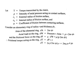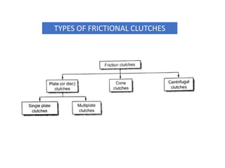 Clutches are mechanical devices that connect or disconnect a driven shaft from a driving shaft, allowing an operator to transmit power between the two shafts. There are different types of frictional clutches, including single plate clutches, which transmit torque via a single plate between the driving and driven shafts.