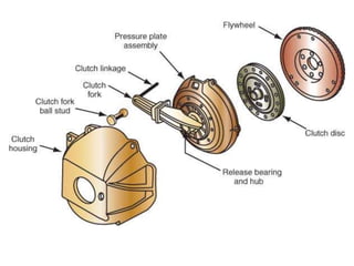 A coupling permanently connects driving and driven shafts, while a clutch can connect or disconnect them. A brake brings one rotating member to a stop while keeping the other member stationary. A clutch uses friction to connect a driving member like an engine flywheel to a driven member like a transmission input shaft, allowing transfer of power when engaged but allowing members to rotate independently when disengaged. A multi-plate clutch can transmit more torque than a single-plate clutch by using multiple alternating friction plates.
