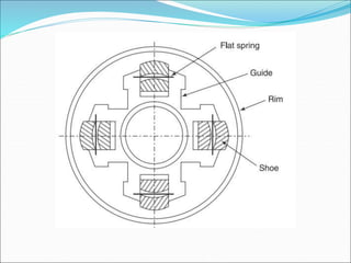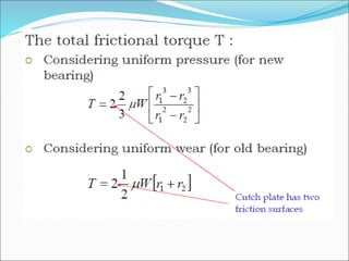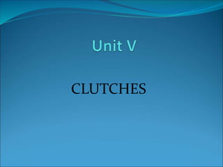 The document discusses different types of clutches, including their purpose, operating principles, and key components. It describes friction clutches like single plate, multi-plate, cone, and centrifugal clutches. A single plate clutch uses one friction plate between a flywheel and pressure plate. A multi-plate clutch increases capacity by stacking multiple friction plates. Cone clutches transmit torque through mating cone shapes. Centrifugal clutches automatically engage at higher speeds via outward force on shoes from spinning.