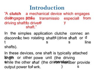 A semi-centrifugal clutch uses both clutch springs and centrifugal force from weighted levers to transmit power from the engine to the clutch shaft. At low engine speeds, clutch springs engage the clutch to transmit power. At high speeds, weighted levers fly outward due to centrifugal force and exert pressure on the pressure plate, firmly engaging the clutch. This reduces the need for stiffer springs and makes clutch operation easier for the driver.