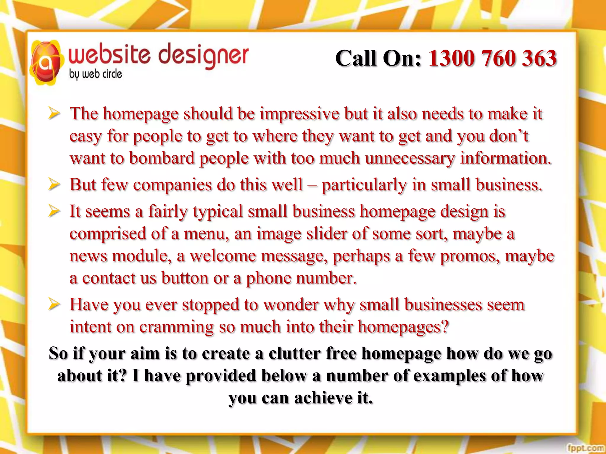 The document discusses the importance of a clutter-free homepage design for small businesses, emphasizing that simplicity facilitates user navigation and conversion. It provides techniques for achieving this, such as using the homepage as a funnel, creating exclusivity, and maintaining a clear purpose, with examples from platforms like Facebook and Google. The document also suggests placing additional content below the fold and features unique design strategies from companies like Apple to enhance user experience.