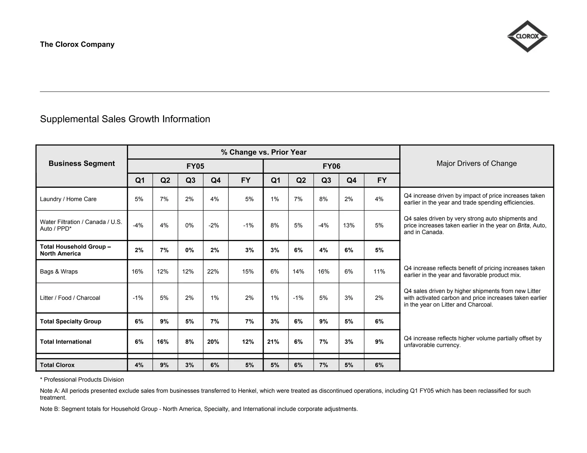 The document provides supplemental sales growth information for The Clorox Company for fiscal years 2005 and 2006, broken down by business segment and quarter, with major drivers of change noted. Several business segments saw higher sales growth in the fourth quarter of 2006 compared to the same period in 2005, driven by factors like price increases, favorable product mix, and higher shipment volumes. Overall, The Clorox Company saw total sales growth of 5% for fiscal year 2006.