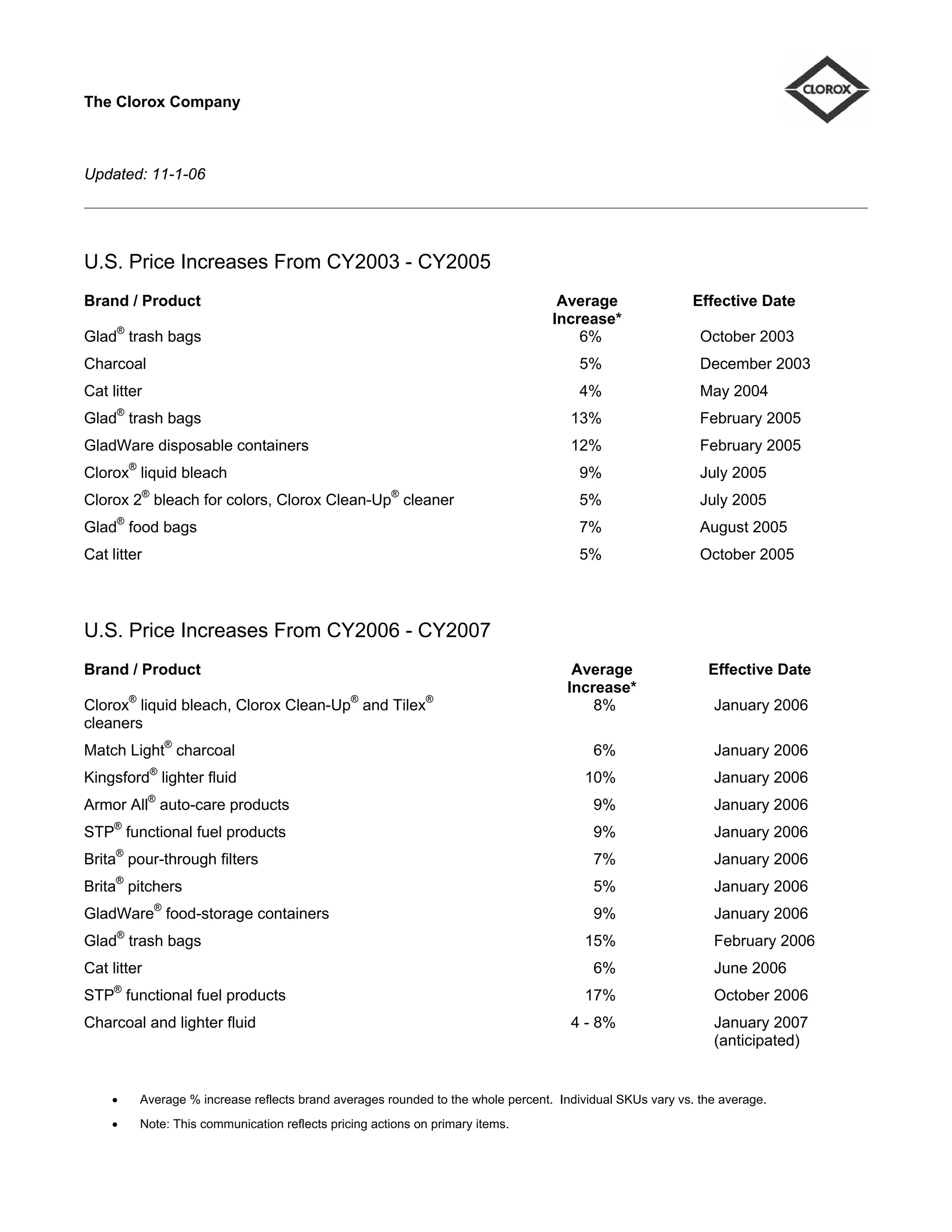 The document outlines price increases by The Clorox Company on various brands and products from 2003 to 2007. Key increases included a 13% increase on Glad trash bags in February 2005, a 9% increase on Clorox liquid bleach in July 2005, and an anticipated 4-8% increase on charcoal and lighter fluid starting in January 2007. The Clorox Company increased prices on numerous brands like Glad, Brita, Clorox, and Kingsford between 2003 and 2007, with increases generally ranging between 4-17% and taking effect between October 2003 and October 2006.