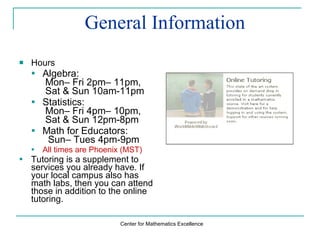 The document provides information about the Center for Mathematics Excellence live online tutoring services, including tutoring hours, how to access tutoring, and tips for working with tutors. Tutoring is available for algebra, statistics, and math for educators courses and supplements other campus math lab services. Tutors are active instructors who can help with concepts but not graded homework or exams. To access tutoring, users select their course from the online tutoring link and choose an available tutor to ask questions and receive help.