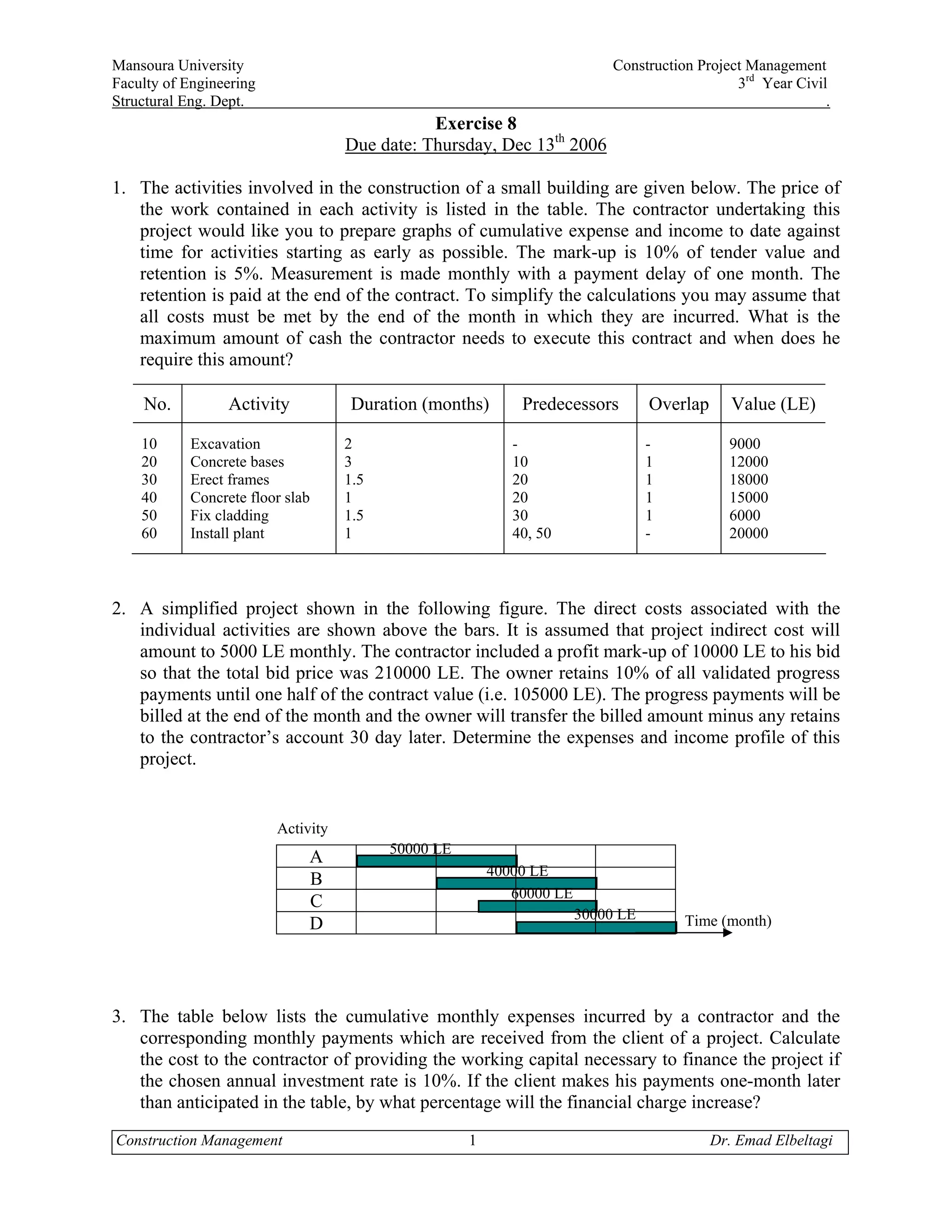 This document contains instructions and information for six exercises related to construction project management. It provides details on activities, costs, schedules, cash flows, and calculations to determine things like maximum cash needs, financial charges, profit margins, and rates of return for several small building and infrastructure projects.