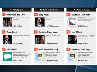 This document provides numerical benchmarks for Australian government brands and politicians on Facebook in September 2013. It shows the average weekly engagement figures and engagement rates for different industries and government entities. It also lists the top performing government brands and campaigns as well as the top 10 politicians by number of Facebook fans. The Queensland Police Service had the most engaged fans and most fans of any government brand.