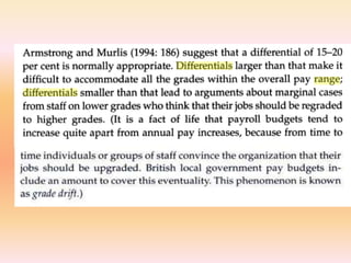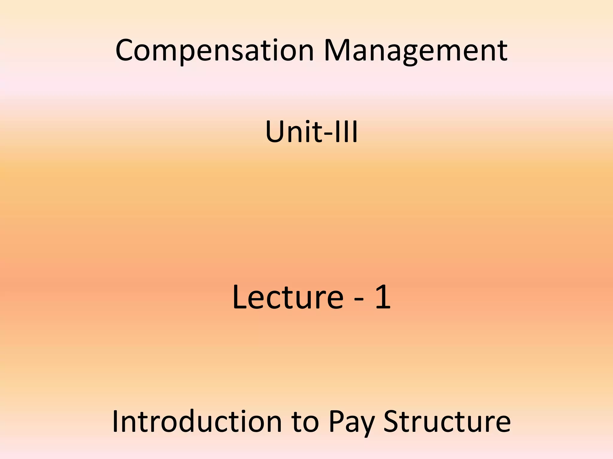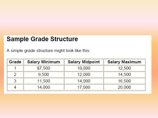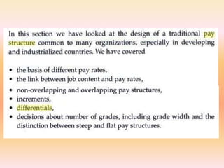 The document provides an overview of compensation management, emphasizing the importance of compensation strategies in attracting, retaining, and rewarding quality staff while aligning with organizational objectives. It discusses the components of designing effective pay structures, including internal and external equity, and outlines various types of pay/reward structures and models. Additionally, the document highlights the challenges and considerations small to medium-sized businesses face in maintaining competitive compensation practices to engage and motivate their employees.