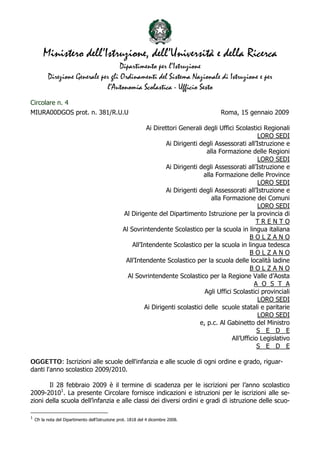 La circolare n. 4 del Ministero dell'Istruzione fornisce istruzioni per le iscrizioni alle scuole dell'infanzia e a ogni grado di istruzione per l'anno scolastico 2009/2010, sottolineando l'importanza di un dialogo tra istituzioni scolastiche, genitori e studenti. Avvisa che il termine per le iscrizioni è il 28 febbraio 2009 e ribadisce l'esigenza di un'informazione dettagliata per facilitare il processo di iscrizione. La circolare evidenzia anche il ruolo delle scuole e delle amministrazioni locali nel garantire un'adeguata offerta formativa e il supporto necessario per un'efficace integrazione degli studenti.