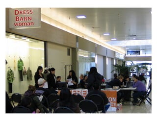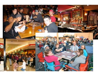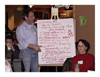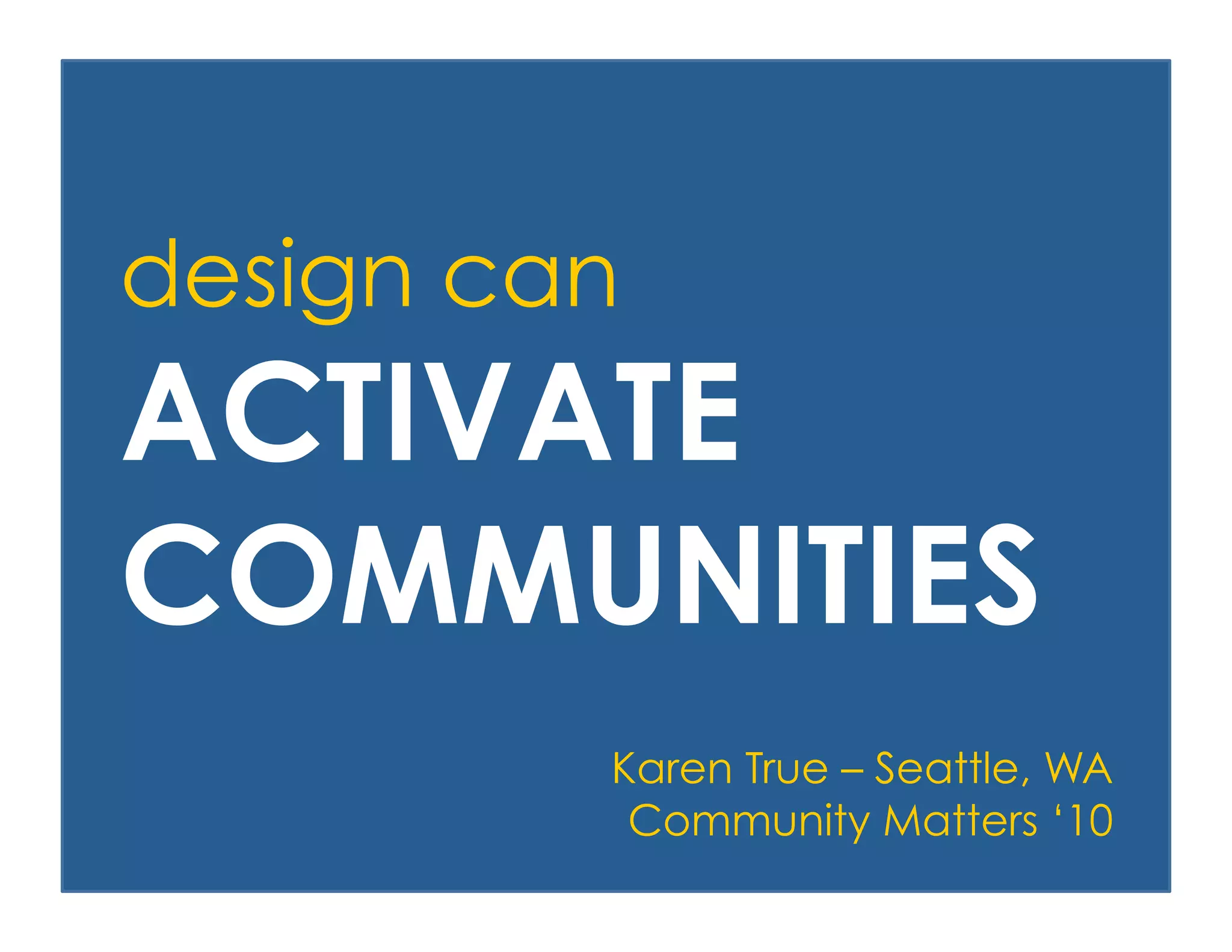 This document discusses how community design can activate communities. It describes how "happening" public places are free, adaptable, comfortable, and host overlapping events. They have committed partners from the community who act as conductors to build connections between people and organizations. The year-long case study described engaged over 1200 people and local organizations in 1206 free community events through a strategy of saying "yes" to opportunities and making introductions.