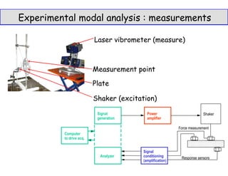 1. The document discusses experimental modal analysis which involves exciting a structure using a shaker, measuring the response using a laser vibrometer, and analyzing the transfer functions between the input and output using a computer.