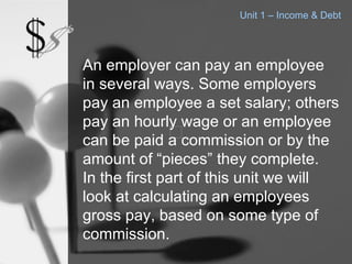 The document discusses calculating employee pay, including commissions. It defines different commission structures like straight commission, salary plus commission, and graduated commission. It provides examples of calculating earnings under each structure. It also discusses calculating net pay by deducting taxes, insurance, and other amounts from gross pay.