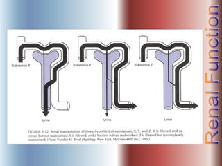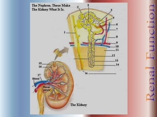 The document discusses renal anatomy, physiology, and urine formation. It describes the two regions of the kidney - the cortex and medulla, and the functional unit of the kidney - the nephron. It explains the three steps in urine formation: glomerular filtration, tubular reabsorption, and tubular secretion. Glomerular filtration filters blood in the kidneys and produces an ultrafiltrate. Most of this filtrate is then reabsorbed back into blood in the tubules, while some substances are actively secreted into the tubular fluid for excretion.