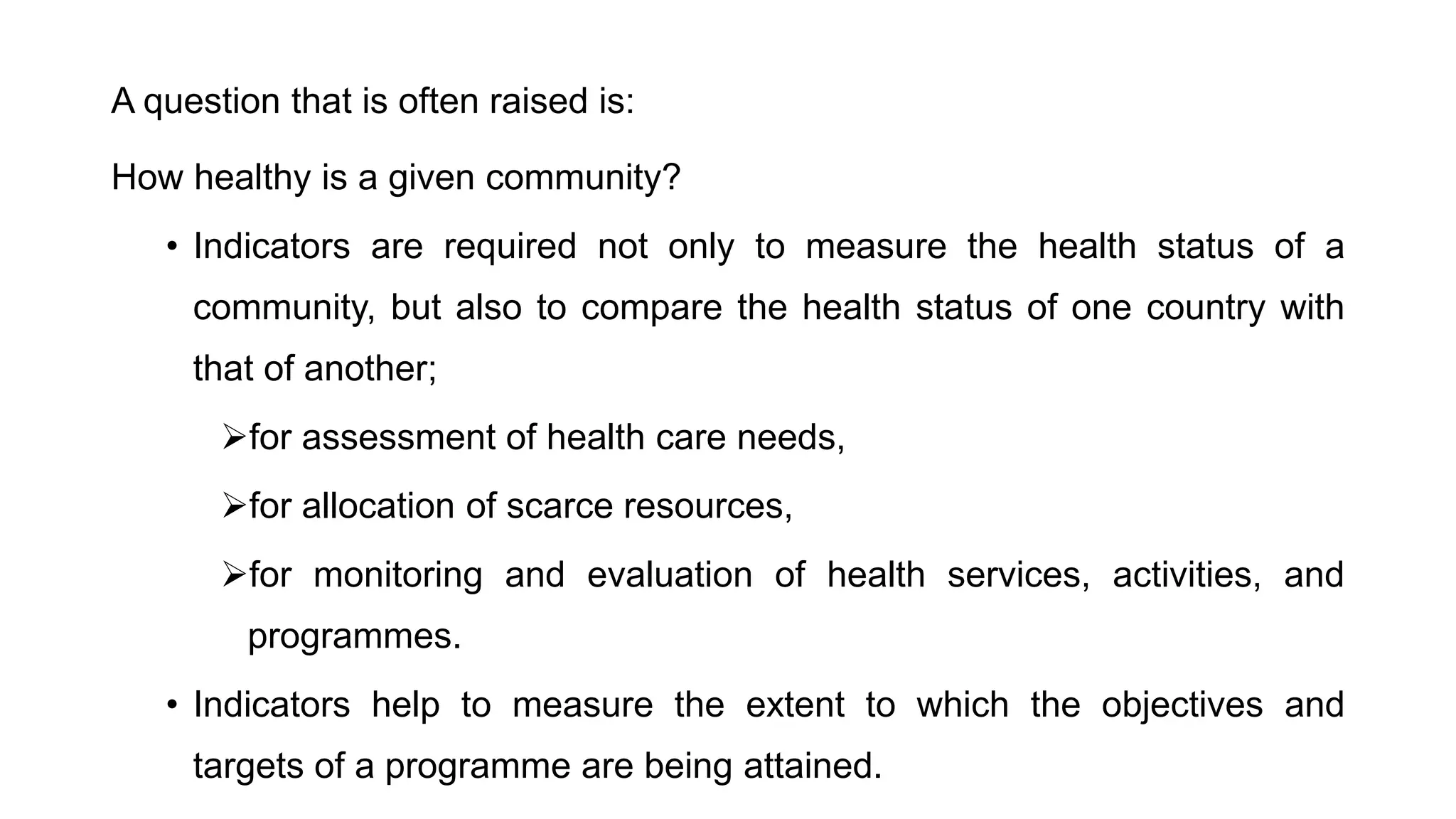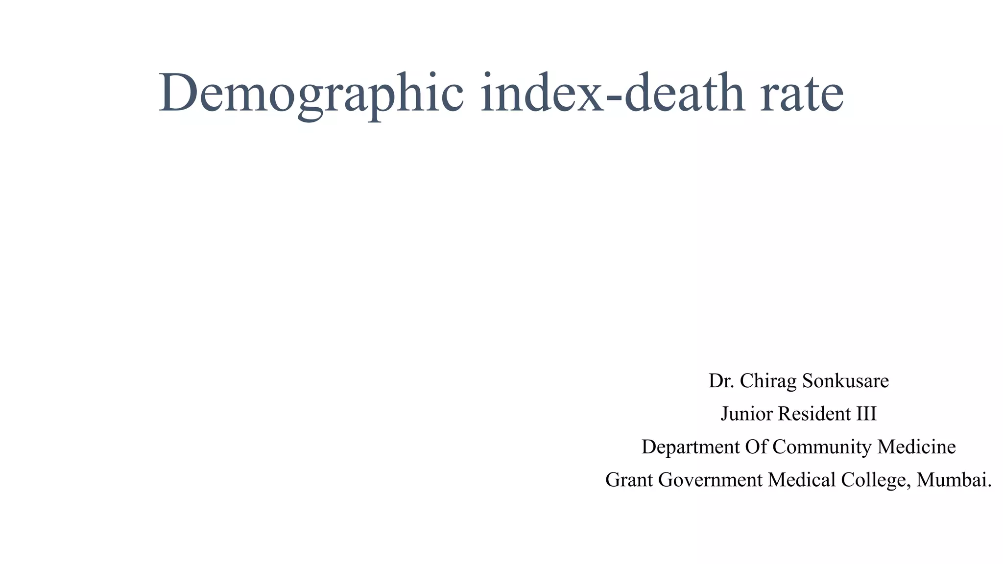 This document discusses demographic indicators that can be used to measure and compare the health status of communities and countries. It describes various mortality rates as important health indicators, including crude death rate, life expectancy, age-specific death rates, infant mortality rate, child death rate, and maternal mortality rate. These indicators provide information on disease burden, health risks, and effectiveness of healthcare programs in a population.