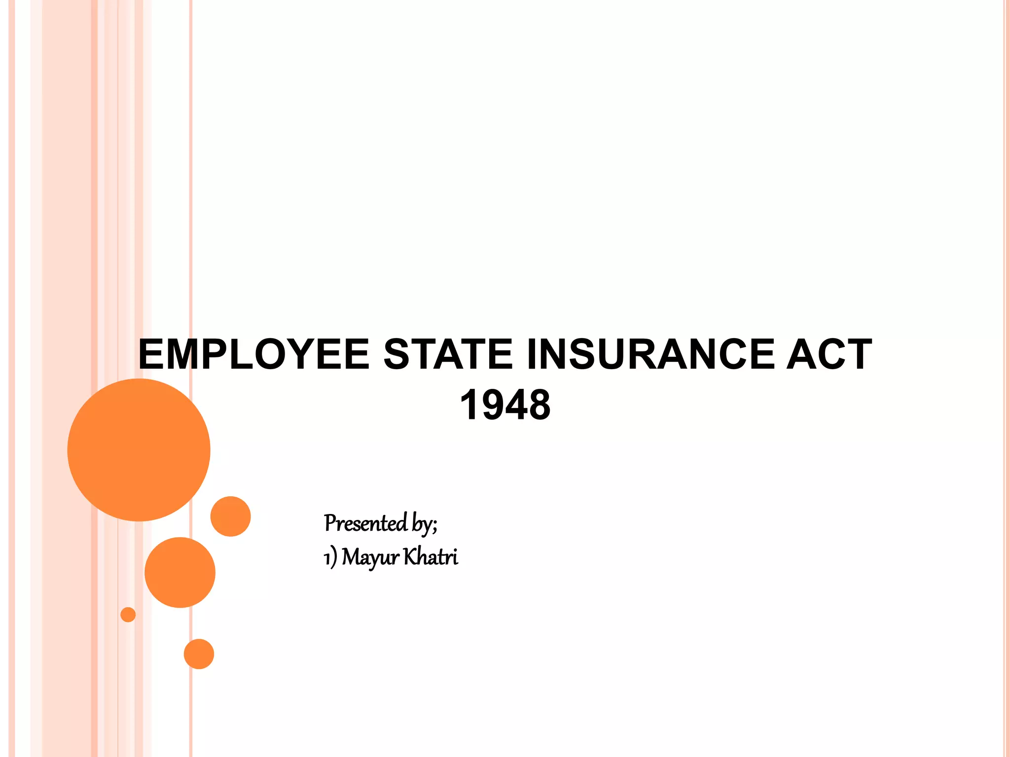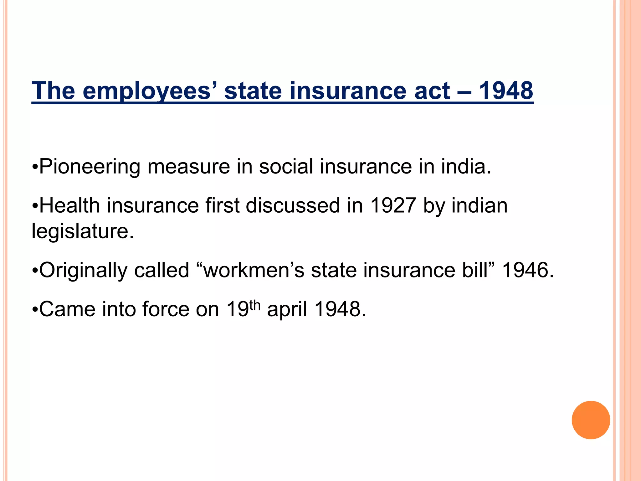 The Employees' State Insurance Act of 1948 provides health insurance and other benefits to employees in India. It originally aimed to provide sickness, maternity, and medical benefits to factory workers and their dependents. Over time, it expanded to apply to other establishments employing a minimum number of people. Key benefits include sickness benefits, maternity benefits, disablement benefits for work-related injuries, dependents' benefits, medical care, and a funeral benefit. Employers must register eligible establishments and employees with the Employees' State Insurance Corporation. The act aims to secure health and financial protection for employees and promote social security.