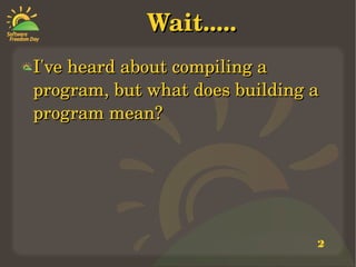 Building a program refers to the process of taking editable source code and other files and transforming them into a finished software product through various steps like preprocessing, compiling, linking, testing, and packaging. CMake is a cross-platform build system developed by Kitware in 2001 that consists of tools like CMake, Ctest, and CPack to manage the entire build process across different platforms.