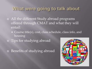 This document provides information on various study abroad programs offered through CMAT, including course titles, estimated costs, class schedules, housing details, and program locations in countries like Ecuador, India, Italy, Scotland, Costa Rica, and Australia/Fiji. It also offers tips for studying abroad such as preparing documents and having emergency contact plans. Some benefits of studying abroad discussed are gaining new experiences and perspectives, improving language skills and resumes, and increasing independence and self-confidence.