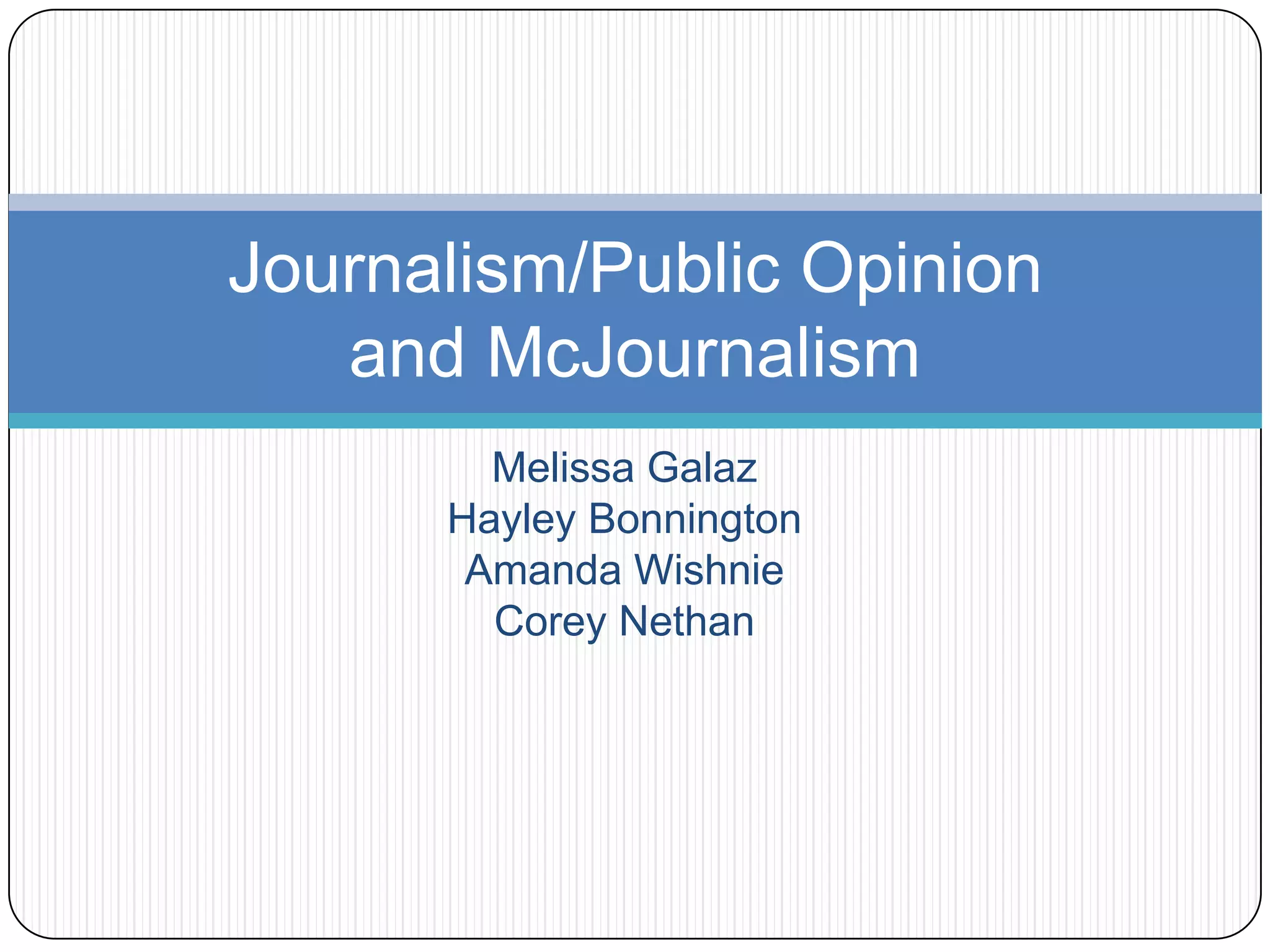 This document discusses journalism, public opinion, and McJournalism. It examines how polls and surveys are often used as a substitute for public opinion but may not accurately represent the public. Journalism is also influenced by money and political agendas. The document analyzes how vox pops and inferences are commonly used to construct public opinion but may not provide a realistic view. It defines characteristics of McJournalism such as efficiency, calculability, predictability, and control, and how this style of journalism can prioritize quantity over quality.