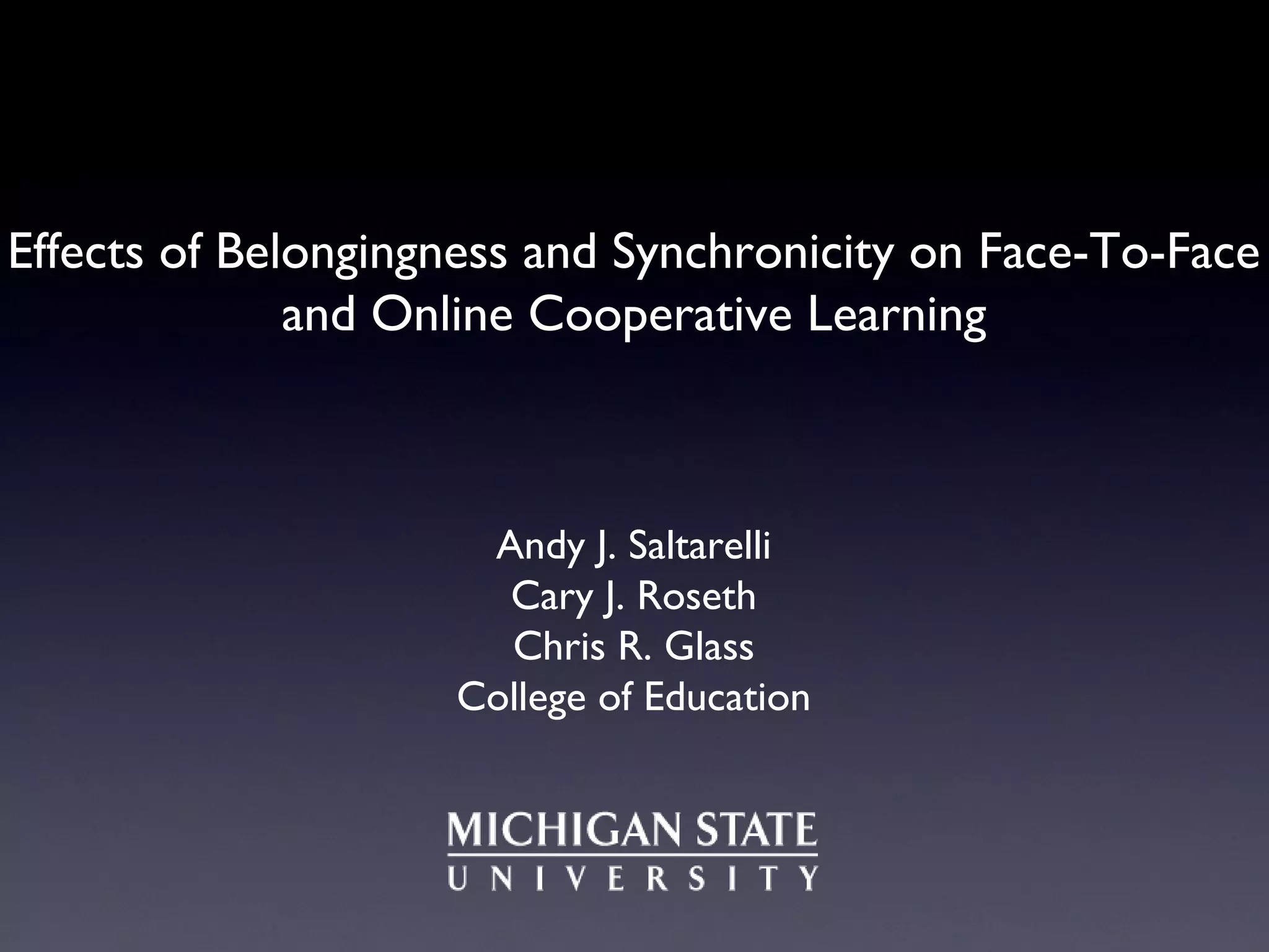 This study examined the effects of initial belongingness and synchronicity on cooperative learning. 171 undergraduate students participated in constructive controversies that varied the level of initial belongingness (acceptance, mild rejection, control) and synchronicity (face-to-face, synchronous online, asynchronous online). Results showed that initial acceptance increased time spent, cooperative perceptions, epistemic regulation, and intrinsic motivation compared to control and mild rejection conditions. Additionally, under mild rejection, asynchronous online discussions led to higher multiple choice scores than face-to-face or synchronous online discussions.