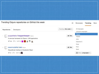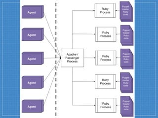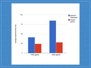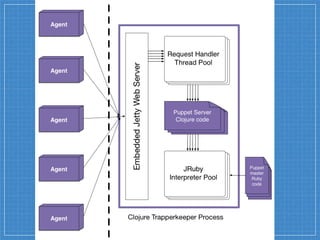This document discusses Puppet moving from Ruby to the Java Virtual Machine (JVM) for its server components. Some of the benefits of running Puppet Server on the JVM include better performance, scalability, and removing the Global Interpreter Lock that affects Ruby. Benchmarking showed Puppet Server running on the JVM was 2-3 times faster than the pure Ruby implementation. The document encourages community involvement to provide feedback and contribute to the Puppet Server and Trapperkeeper projects on GitHub.