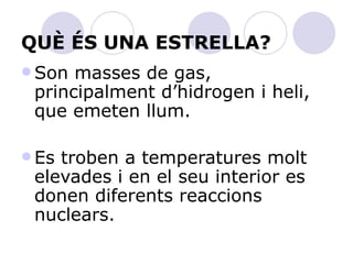 QUÈ ÉS UNAESTRELLA? Son masses de gas, principalment d’hidrogen i heli, que emeten llum. Es troben a temperatures molt elevades i en el seu interior es donen diferents reaccions nuclears .