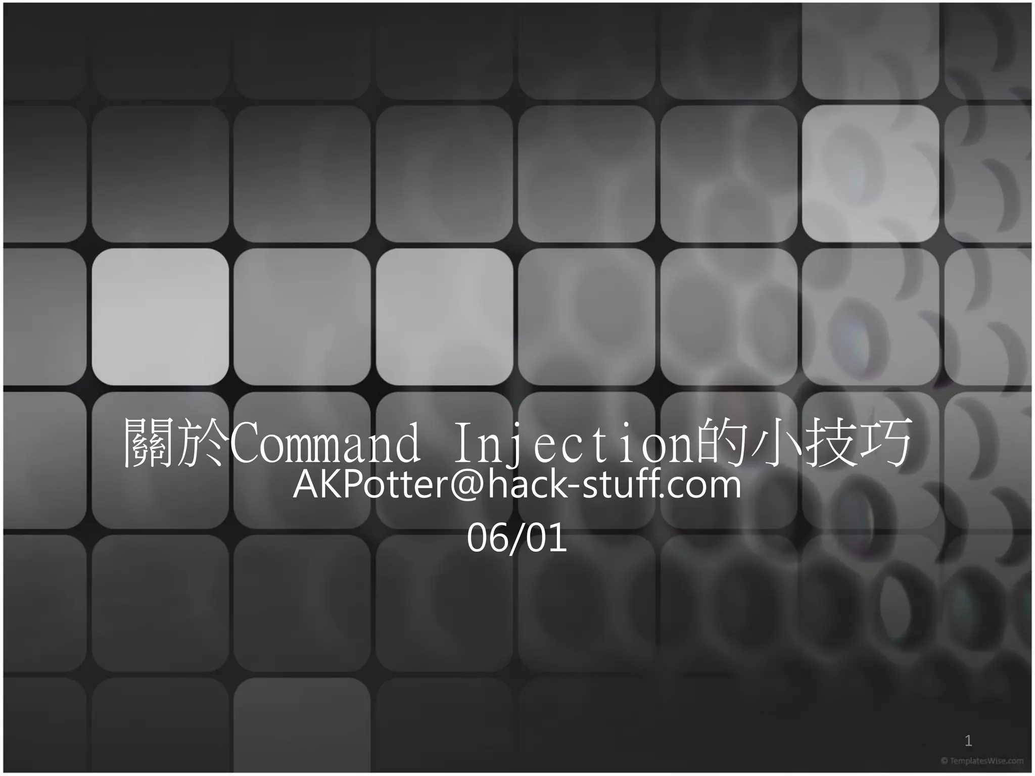 该文档讨论了命令注入的技术细节,包括测试模式、获取shell的技巧以及反向shell的实现方法,同时也介绍了Struts2漏洞的利用。文中提供了多种命令和实例,对Linux和Windows环境下的操作进行了比较。最后总结了命令注入的应用和Struts2漏洞的相关信息。