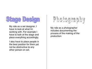 My role as a photographer for a stage production is to document the process and place people and objects on stage in positions that are visually appealing yet do not obstruct others. David Bailey became a photographic assistant in 1959 before working for Vogue magazine in 1960. Along with Terence Donovan, he helped capture the "Swinging London" culture through fashion and celebrity photography in the 1960s, socializing with celebrities and becoming celebrities themselves as the first famous celebrity photographers.