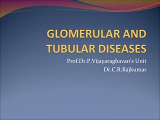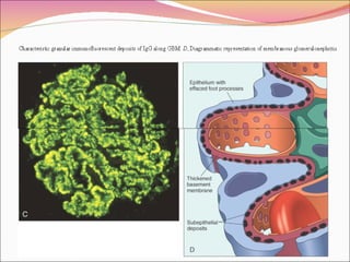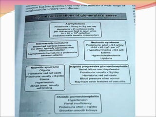 1. Glomerular diseases are caused by damage to the glomerulus and can manifest as nephritic syndrome, nephrotic syndrome, or hematuria. Common glomerular diseases include minimal change disease, membranous nephropathy, and focal segmental glomerulosclerosis.