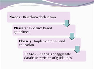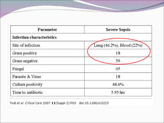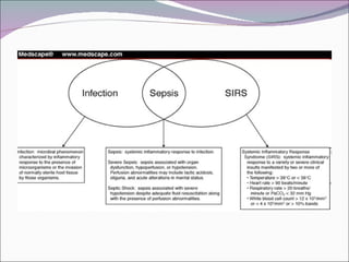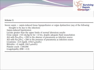 The document traces the history and understanding of sepsis from ancient times to modern day. It discusses early Greek, Arabic, and European physicians who noted connections between infections, fever, and mortality. In the 1840s, Ignaz Semmelweis demonstrated that handwashing with chlorinated lime solution reduced maternal mortality from childbed fever. Louis Pasteur and Joseph Lister later established the germ theory of disease. Modern definitions of sepsis emerged in the 20th century as understanding of the host inflammatory response improved. Current efforts through the Surviving Sepsis Campaign aim to standardize diagnosis and management to reduce the high mortality rates associated with severe sepsis and septic shock.