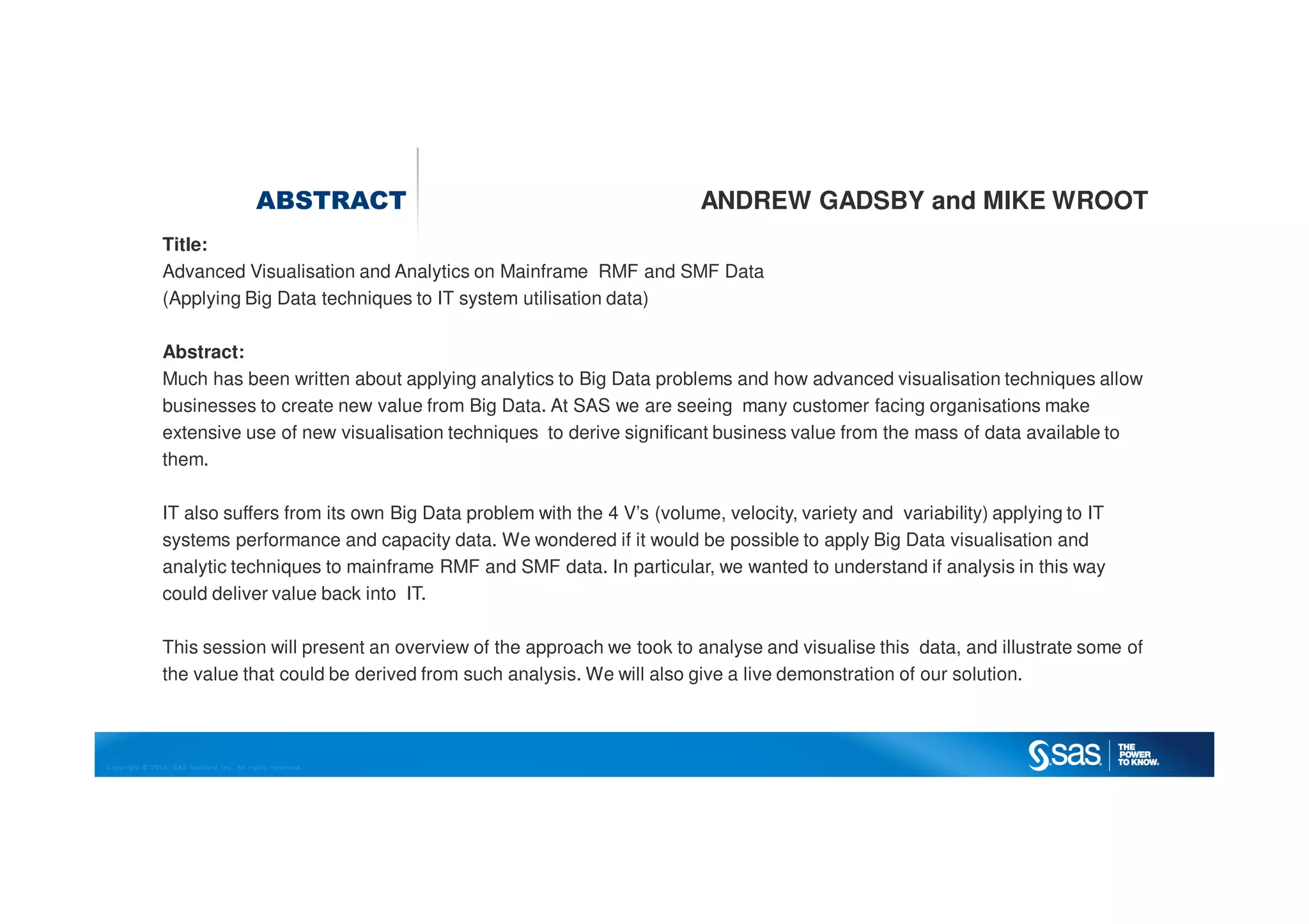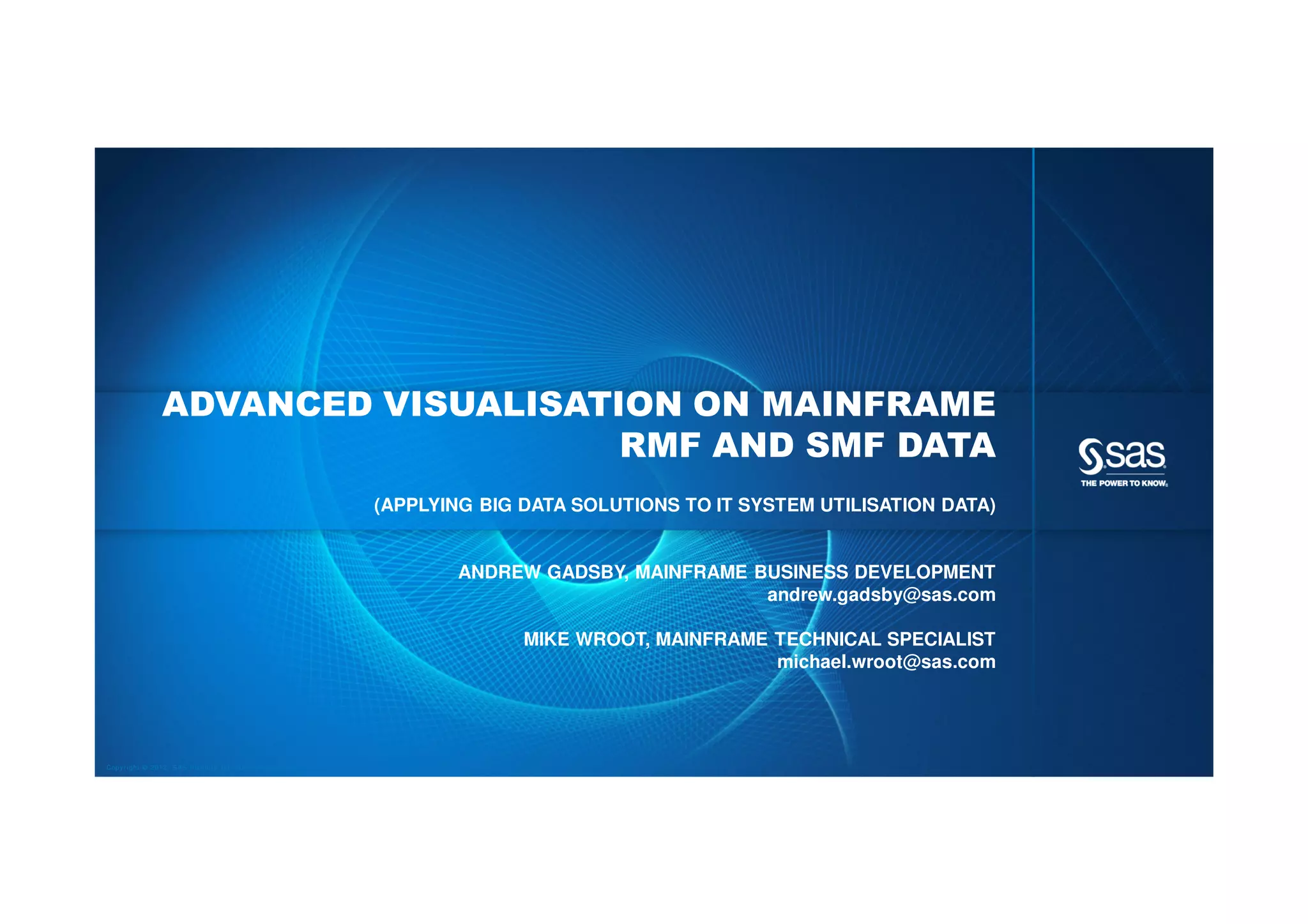 The document discusses the application of advanced visualization and analytics techniques on mainframe RMF and SMF data to leverage big data solutions for IT system utilization. It emphasizes the challenges presented by big data characteristics and the potential business value derived from effective data analysis and visualization. The session includes demonstrations of new techniques and explores the integration of visual analytics into capacity reporting and forecasting processes.