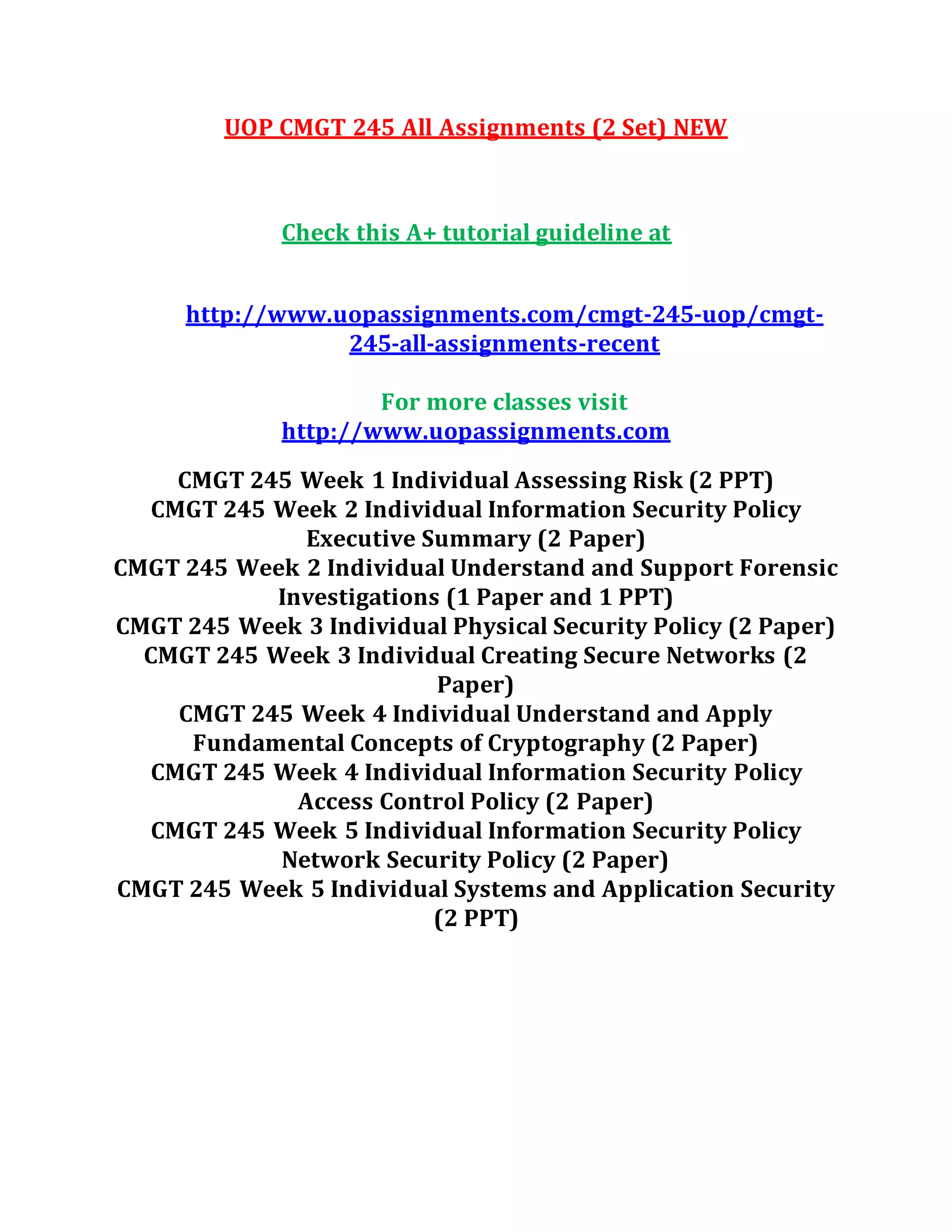 The document outlines a series of assignments for the course CMGT 245, focusing on various aspects of information security, including risk assessment, policy drafting, forensic investigations, secure networks, cryptography, and systems security. Each week involves specific tasks such as creating presentations, writing papers, and taking courses on platforms like Pluralsight, with requirements for screenshots and APA formatting. The assignments cumulatively aim to develop comprehensive information security policies through collaborative discussions and practical applications.