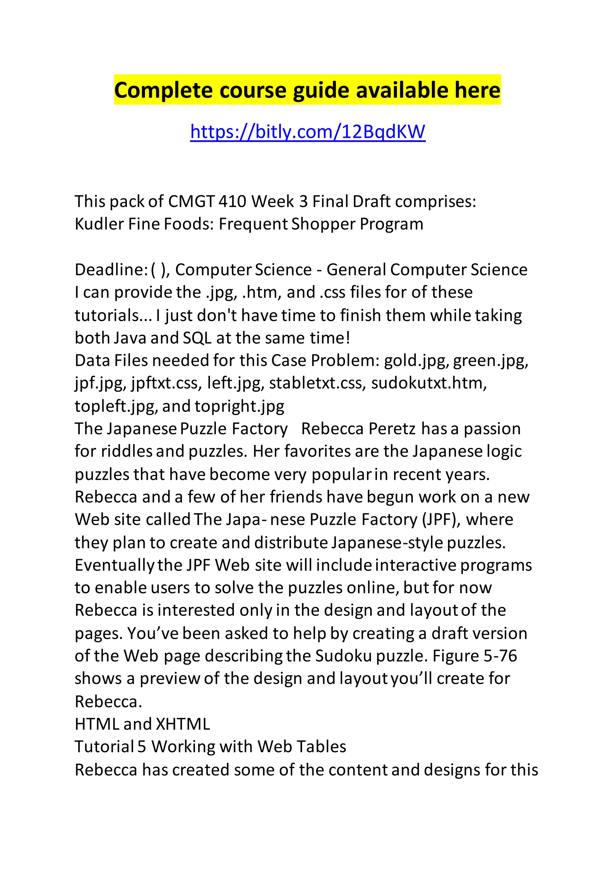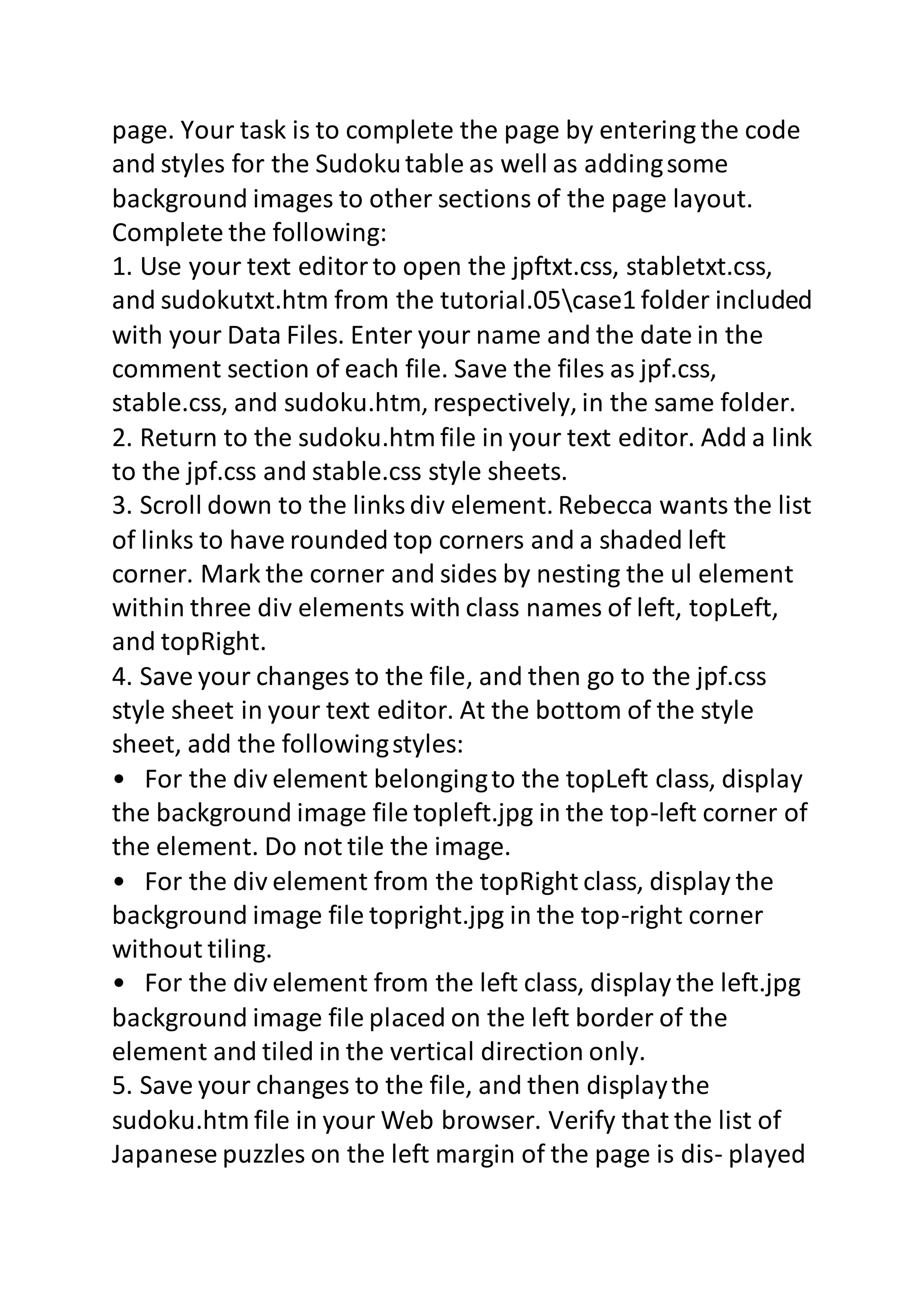 This document provides instructions for completing a draft web page layout for a Japanese puzzle website. It involves adding CSS styles and HTML markup to structure the content, including styling a Sudoku puzzle grid embedded in the page. Key tasks include linking style sheets, adding div wrappers with background images, and structuring the Sudoku grid using table elements with nested tables and box classes. Completing the tasks will produce a preview of the web page layout as shown in the provided design.