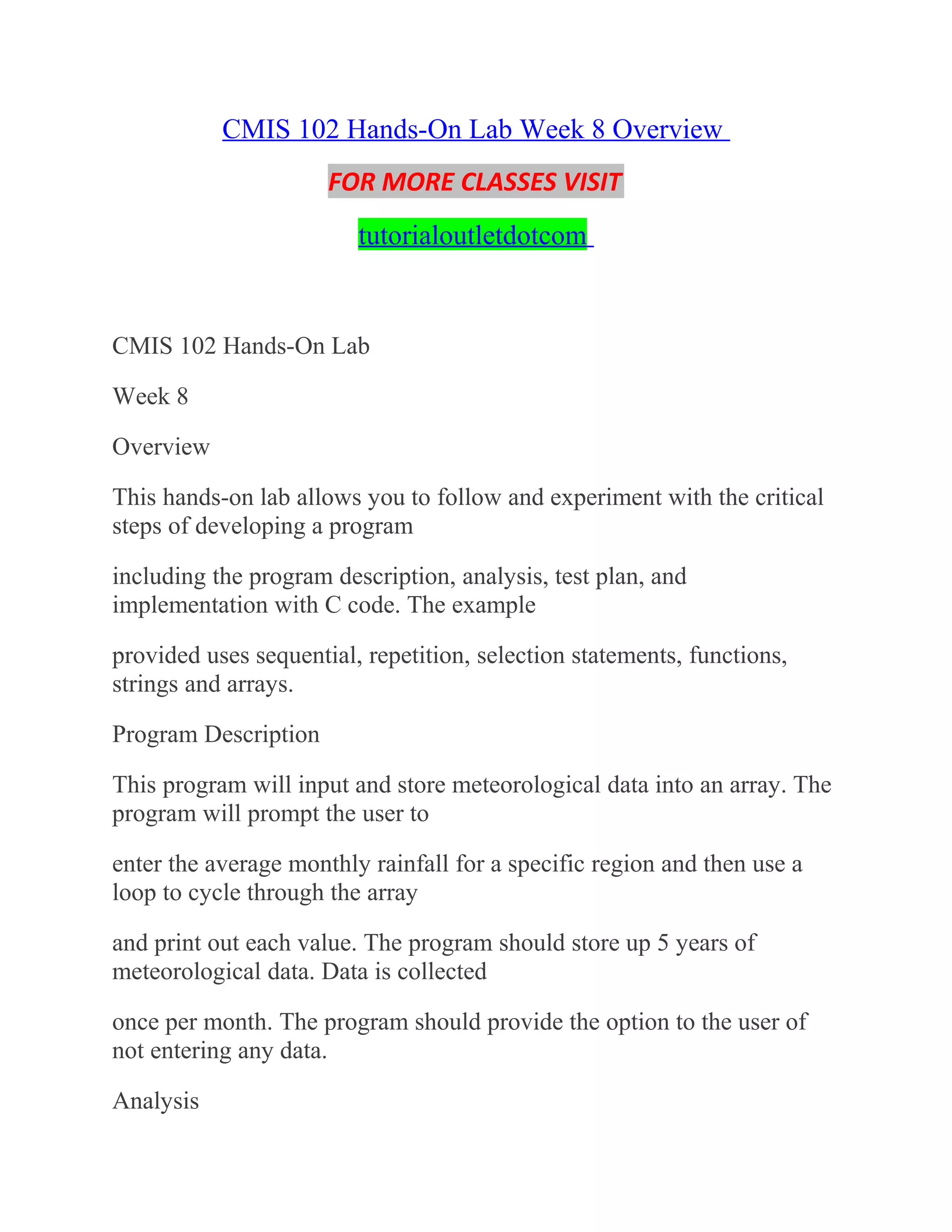 This document provides an overview of a hands-on lab for a CMIS 102 class. The lab involves developing a C program to input and store meteorological data in arrays. The program will prompt the user to enter monthly rainfall over multiple years and print the stored data. The analysis section describes using arrays, loops, and functions to input, store, and output the data. A test plan provides sample input/output to verify the program is working properly. The C code implementation is also included, along with learning exercises for students to further develop the program.
