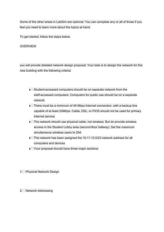The document provides details for a networking project. The student has been hired to design the network infrastructure for a new UMUC building in Adelphi, Maryland that will house offices, classrooms, a library and computer labs. The student must submit a network proposal with sections on the physical design, network addressing, and network services. The proposal must meet criteria such as separating student and staff networks, using physical cabling with some wireless access, and assigning IP addresses within the 10.11.12.0/23 range. Floor plans and details about the building layout, including the number of computers in each room, are provided to aid in the network design.