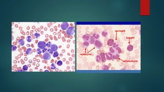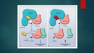The document discusses diagnosis, management, and recent advances in chronic myelogenous leukemia (CML). CML results from a reciprocal translocation between chromosomes 9 and 22, known as the Philadelphia chromosome, which produces the BCR-ABL fusion gene and oncogenic protein. Treatment involves tyrosine kinase inhibitors like imatinib, nilotinib, and dasatinib to inhibit BCR-ABL. Response is monitored through hematologic, cytogenetic, and molecular testing. Resistance can develop through mutations, requiring alternative TKIs or allogeneic stem cell transplant in some cases.