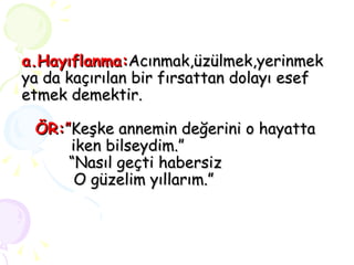 a.Hayıflanma: Acınmak,üzülmek,yerinmek yada kaçırılan bir fırsattan dolayı esef etmek demektir. ÖR: ” Keşke annemin değerini o hayatta iken bilseydim.” “Nasıl geçti habersiz O güzelim yıllarım.”