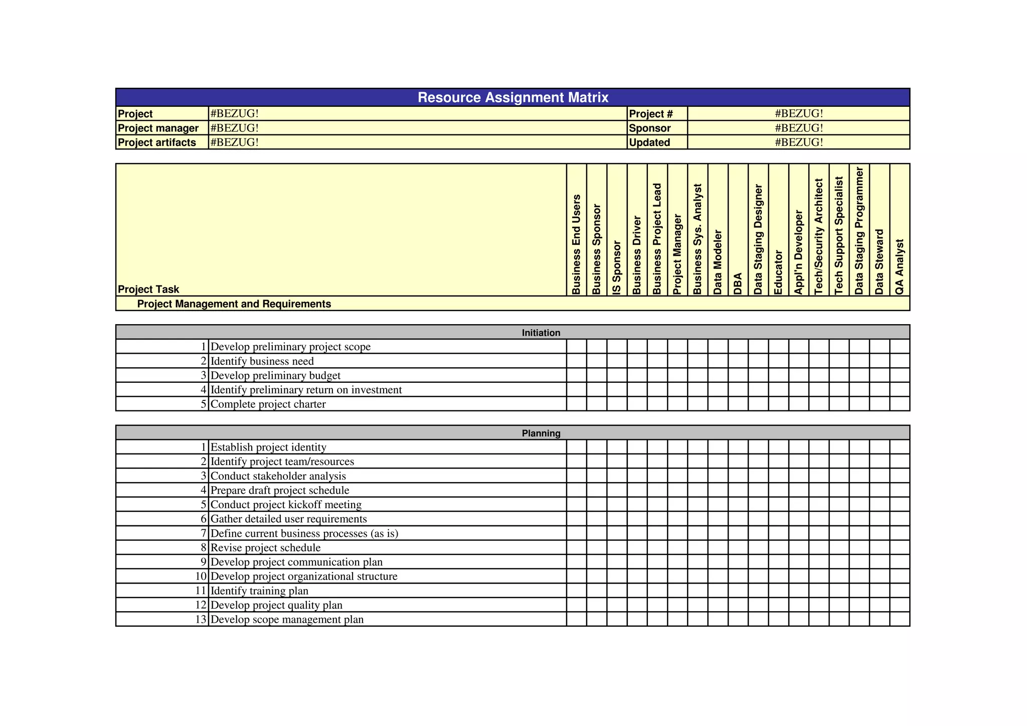 The document is a resource assignment matrix that outlines the tasks and deliverables for a project and assigns resources responsible for each task. It shows the initiation, planning, execution, and closing stages of the project. For each task, it indicates which types of resources (e.g. project manager, business analyst, developer) are responsible by marking them with symbols like creates, inputs required, reviews, approves, notified. This allows tracking responsibility and involvement for all project work.