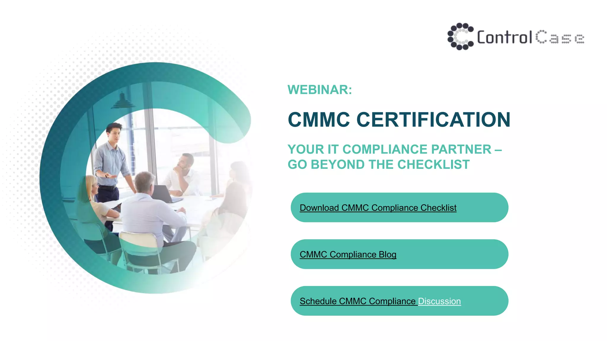 This webinar provides an overview of the CMMC certification process and how ControlCase can help organizations achieve and maintain compliance. It discusses what CMMC is, who it applies to, the different certification levels, and the assessment process. ControlCase offers certification services to help clients become certified in CMMC and other standards with one audit. It also provides continuous compliance services through automated tools to address vulnerabilities and ensure ongoing compliance.