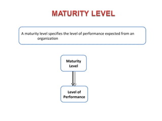 The document outlines the Capability Maturity Model Integration (CMMI), emphasizing its role in process improvement and systems engineering for organizations. It details different maturity levels from initial (level-1) to optimizing (level-5) and describes the importance of integration in product and process development. Additionally, it highlights various engineering disciplines such as software and system engineering, as well as the critical aspects of software acquisition and quality management.