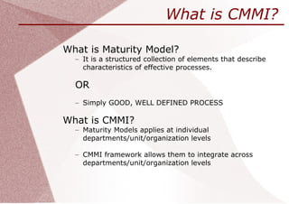 CMMI (Capability Maturity Model Integration) is a framework that describes best practices for processes that organizations can implement to improve their performance. It allows organizations to assess their processes, integrate departments, set process improvement goals, and benchmark their practices. Implementing CMMI leads to more directed, coordinated work with predictable results, as opposed to working randomly without clear goals. CMMI has five levels of process maturity. While individuals cannot be CMMI certified, companies can be appraised and certified at a given CMMI level. Many large IT services companies pursue CMMI accreditation.