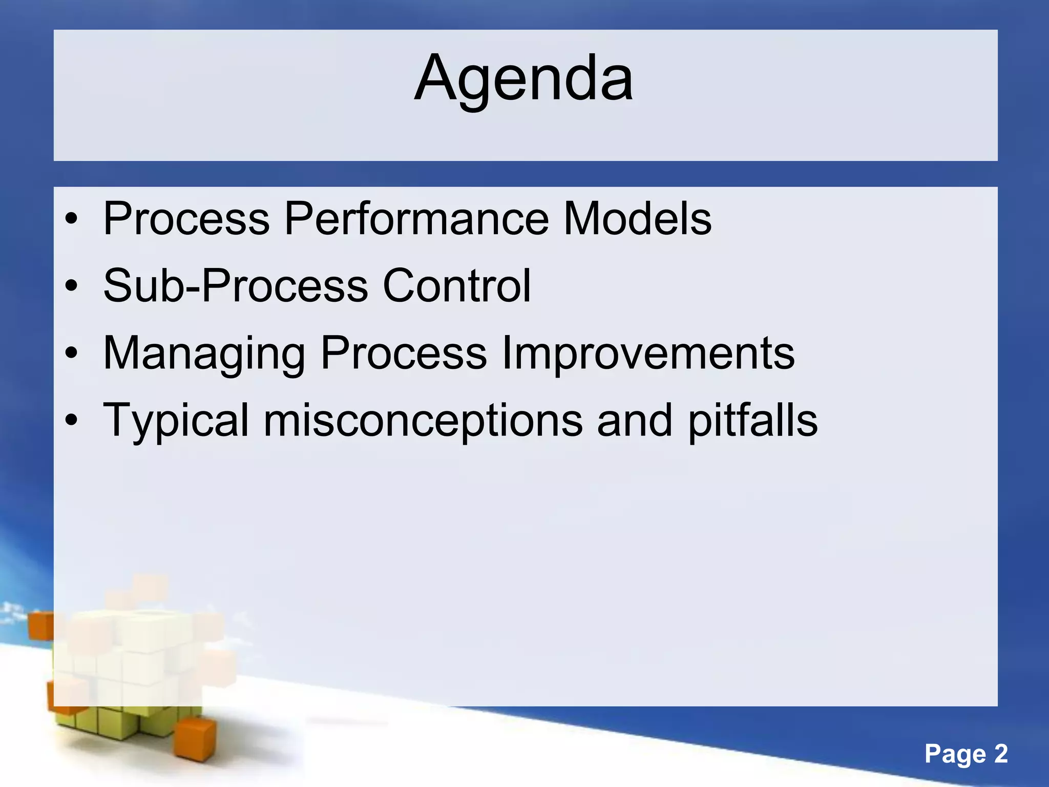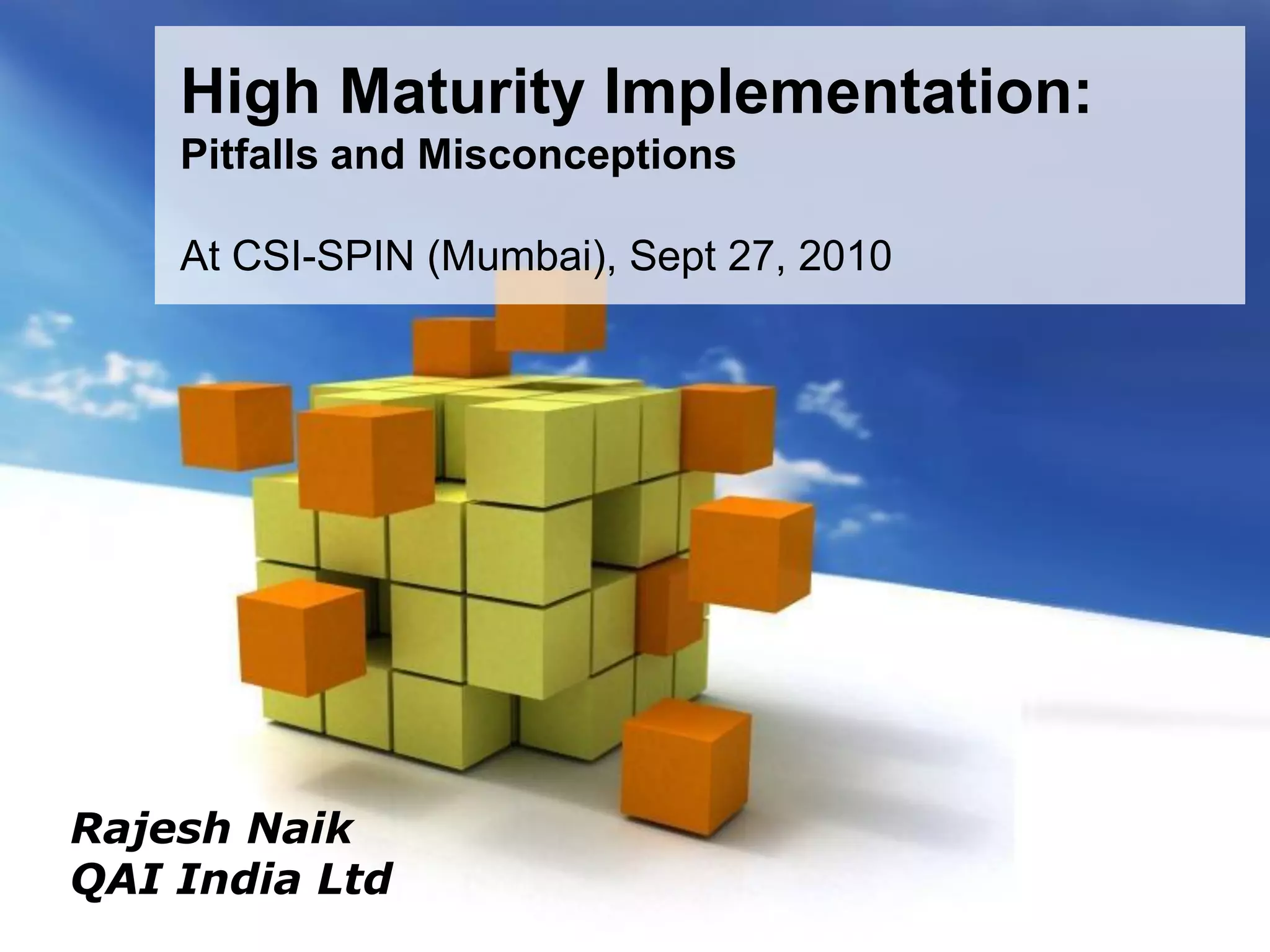 This document discusses high maturity process implementation and common pitfalls. It begins by outlining the agenda, which includes process performance models, sub-process control, managing process improvements, and typical misconceptions and pitfalls. It then discusses how process performance models are complex because reality is complex, and outlines simplifications commonly made. It also notes that outcomes of complex processes are difficult to intuitively predict. The document concludes by identifying common issues seen in implementing high maturity practices and what should be seen in future high maturity implementations to address these issues.