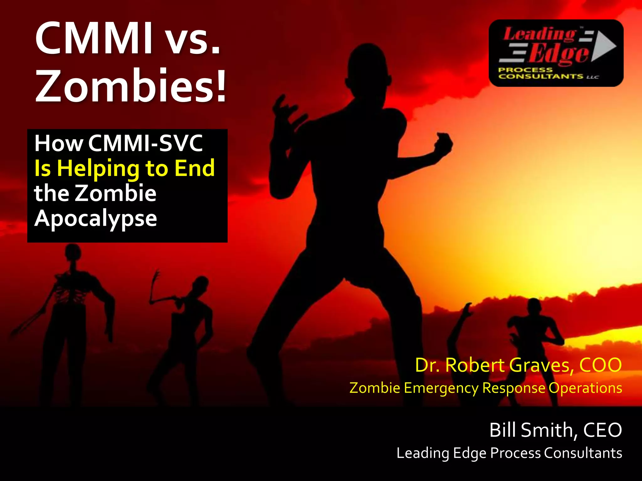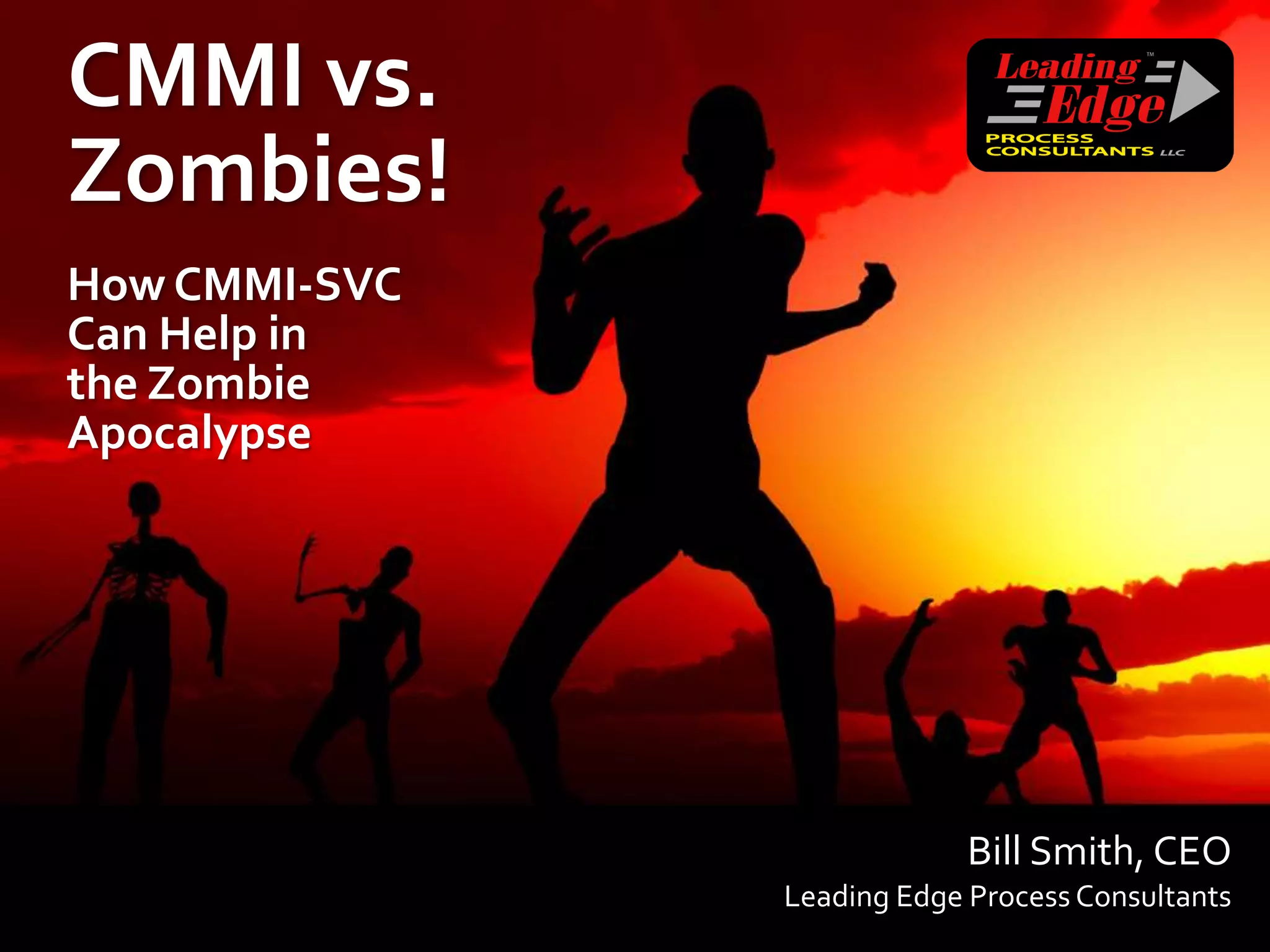 The document humorously discusses the application of CMMI-SVC in the context of a fictional zombie apocalypse, presented by Bill Smith as Dr. Robert Graves. It outlines how CMMI-SVC can be used to manage emergency services, including zombie control and medical response, emphasizing strategic planning and resource management. The presentation also incorporates humor and fictional elements to draw parallels between service management practices and crisis scenarios.