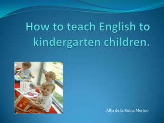 This document provides guidelines for teaching English to kindergarten children. It recommends using a full immersion approach that integrates English into other subjects and focuses on meaningful communication rather than explicit grammar instruction. Teachers should provide an age-appropriate environment that makes use of songs, games, stories and visual cues to help children learn vocabulary and pronunciation in a fun, motivating way without pressuring them to speak until they are ready. Repetition and limiting instruction to short, simple sentences and activities is emphasized.