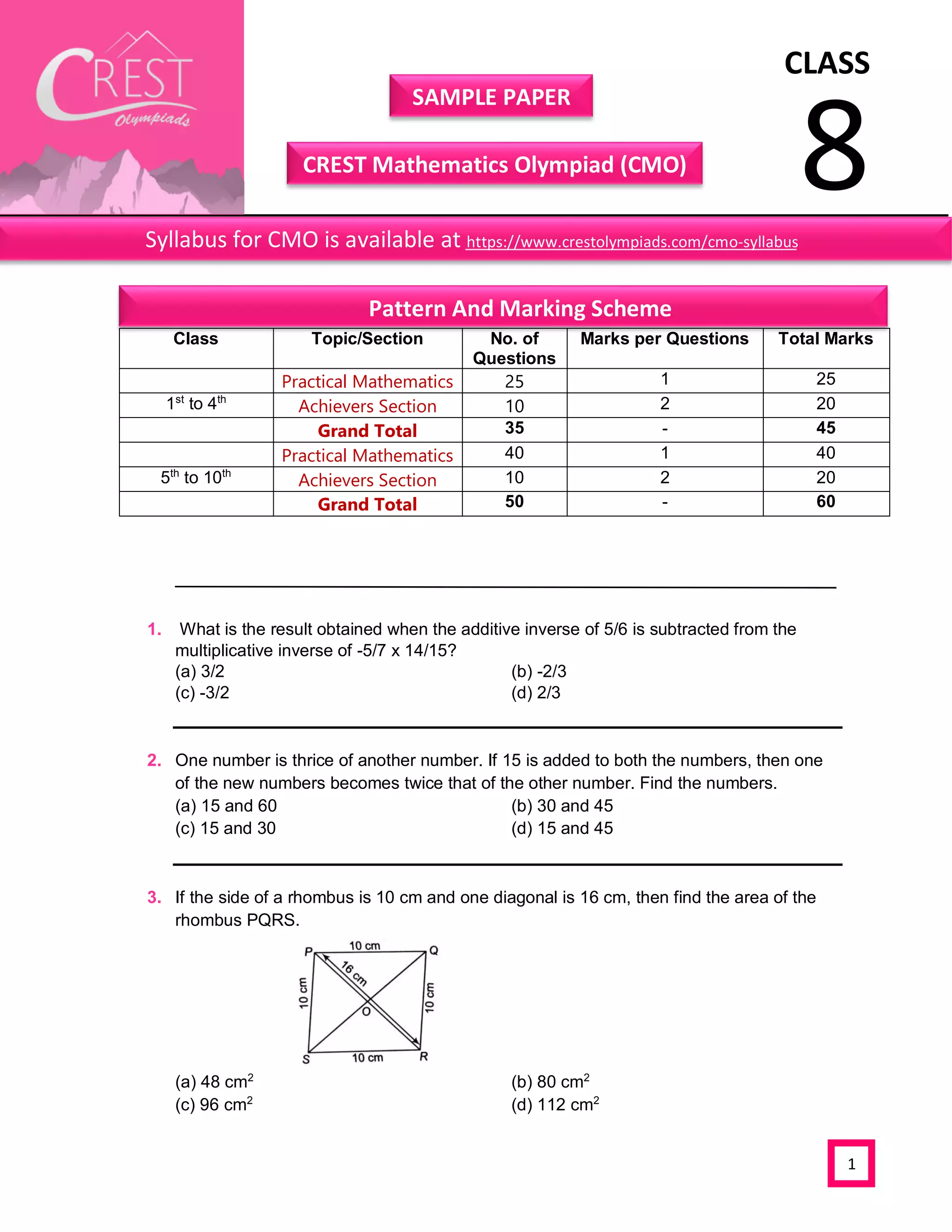 The document is a sample paper for the Class 8 Crest Mathematics Olympiad, containing a variety of mathematics questions across different topics, including geometry, algebra, and area calculations. It includes both multiple-choice questions and answers, along with a breakdown of sections and total marks for achievers. Additionally, it provides a link to the syllabus and details about the structure of the paper.