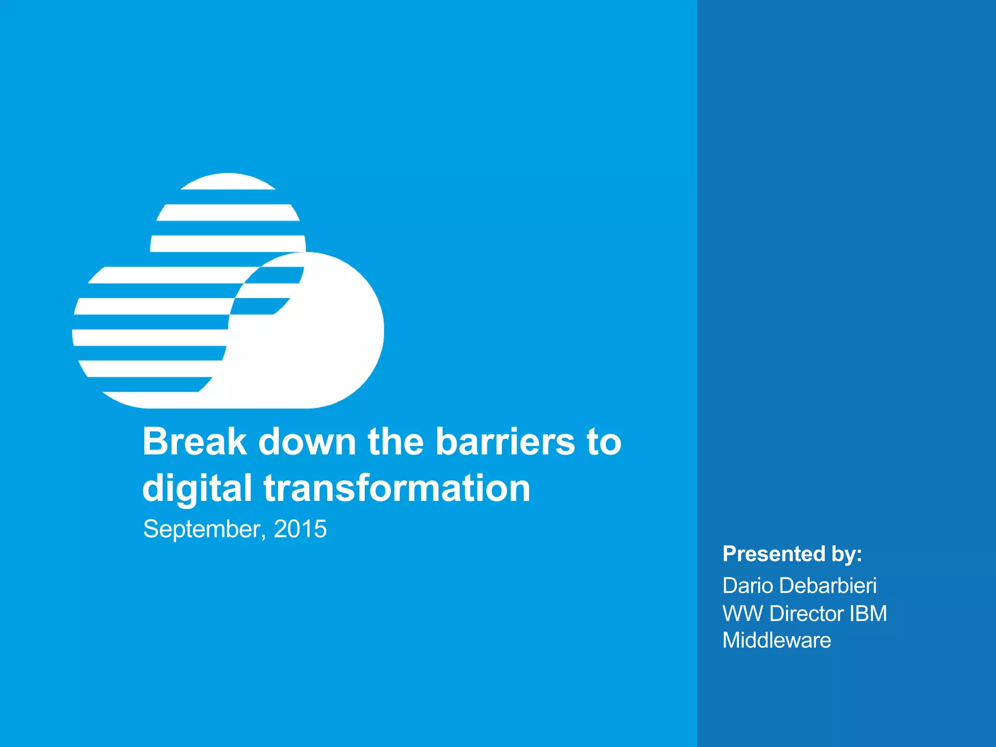The document discusses how digital transformation is changing businesses through social media, cloud computing, mobile devices, big data and the internet of things. It notes that 81% of customers depend on social media for purchasing advice, 62% of workloads will be cloud-based by 2016, over 1 billion smart devices were shipped in 2013, 90% of data created in the last two years, and 50 billion internet of things devices will be connected by 2020. The document advocates that businesses must break down barriers to digital transformation like organizational silos, outdated business processes, and issues with accessing and analyzing data across different environments and ecosystems. It presents IBM's solutions for helping businesses optimize decisions, embrace agile development, reinvent processes, and deliver personalized experiences