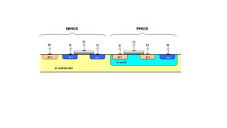 The document discusses CMOS technology which uses both NMOS and PMOS transistors in a complementary way. It has low power dissipation as power is only consumed during switching. CMOS circuits like inverters, NAND and NOR gates are constructed using a pull-up network of PMOS transistors and a pull-down network of NMOS transistors. The fabrication of CMOS transistors involves depositing and patterning materials on a silicon wafer through lithography. CMOS has advantages like low power, high noise immunity and is widely used in applications like computers, processors and memory chips.