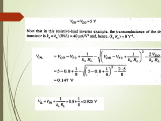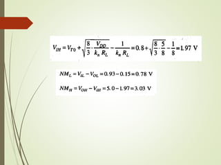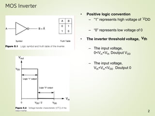 1. The document discusses the static characteristics of MOS inverters, including their voltage transfer characteristic (VTC). The VTC describes the output voltage (Vout) as a function of the input voltage (Vin) under DC conditions.