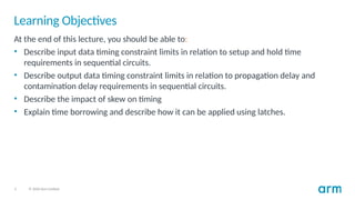 The lecture on sequential circuit design covers input and output timing constraints, including setup and hold times, as well as propagation and contamination delays. It discusses various sequencing elements like latches and flip-flops, their designs, and the importance of timing analysis in ensuring circuit functionality. Additionally, it highlights timing closure processes to meet design specifications and introduces concepts like time borrowing and clock skew.