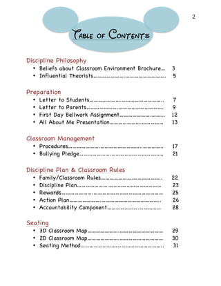 This document is Jessica Mills' classroom management plan for her 3rd grade classroom. It includes sections on her discipline philosophy which references theorists like the Canters and Kounin, preparation materials like letters to students and parents, classroom procedures, and a discipline plan. The discipline plan uses a ticket system where students can earn and lose tickets for their behavior which can be redeemed for rewards. It also includes family/classroom rules, consequences for breaking rules, and a calming center for students to take breaks in. The plan shows preparation for building a positive classroom community and structure for managing student behavior.