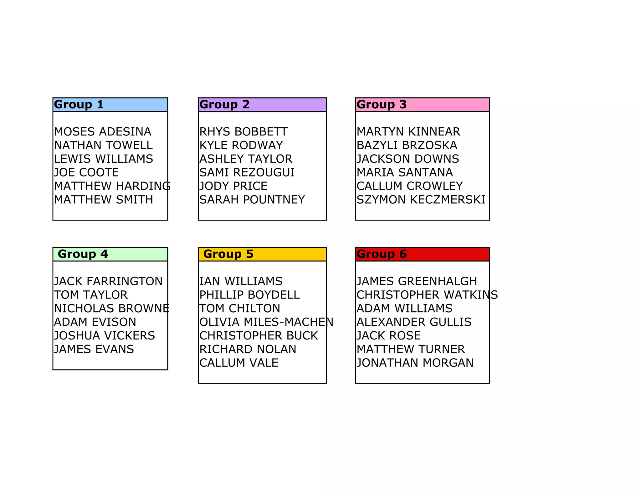 The document lists 18 students divided into 6 groups of 3. Group 1 contains Moses Adesina, Nathan Towell, and Lewis Williams. Group 2 contains Rhys Bobbett, Kyle Rodway, and Ashley Taylor. Group 3 contains Martyn Kinnear, Bazyli Brzoska, and Jackson Downs.